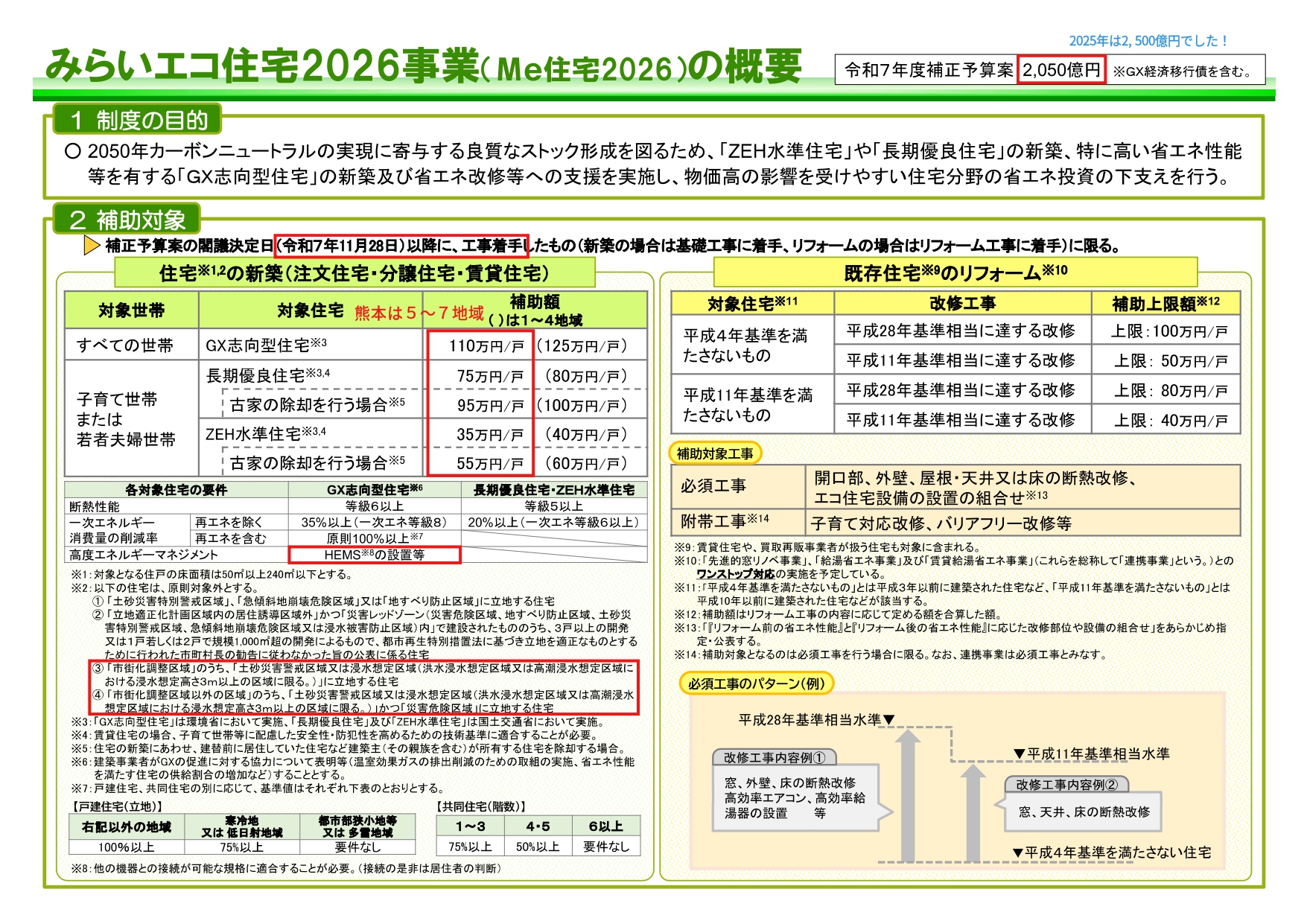 2025.12.01 お知らせ 【お知らせ】2026年度補助金について 2026年度の補助金について、発表がありました。(閣議決定になりました!) 「みらいエコ住宅2026事業」概要は下記の通りです。 また、リフォームや窓リノベ等の補助金も今年に引き続き実施されます。 詳細は以下のホームページまたは新規建設までご連絡ください。 住宅:みらいエコ住宅2026事業について – 国土交通省