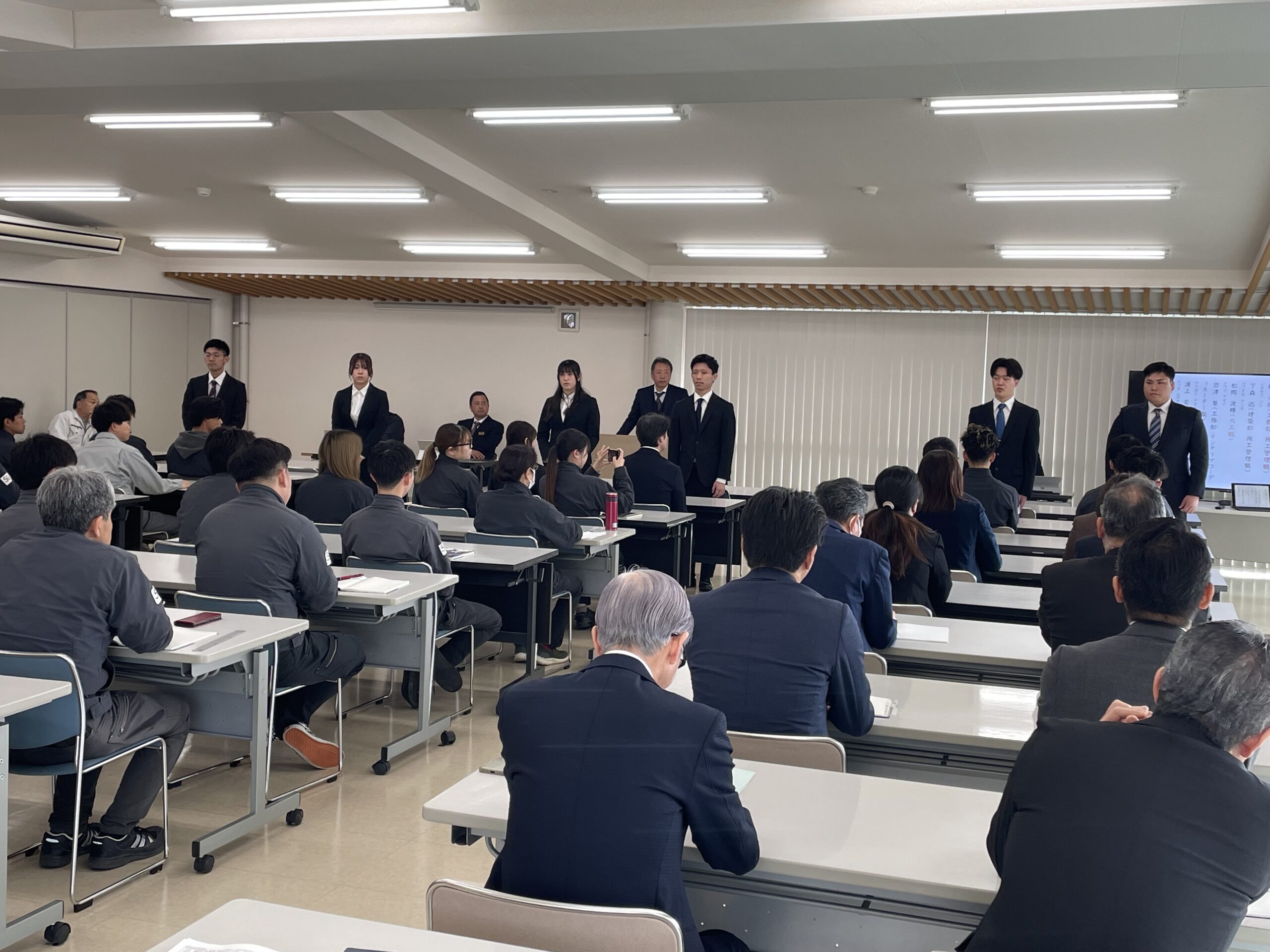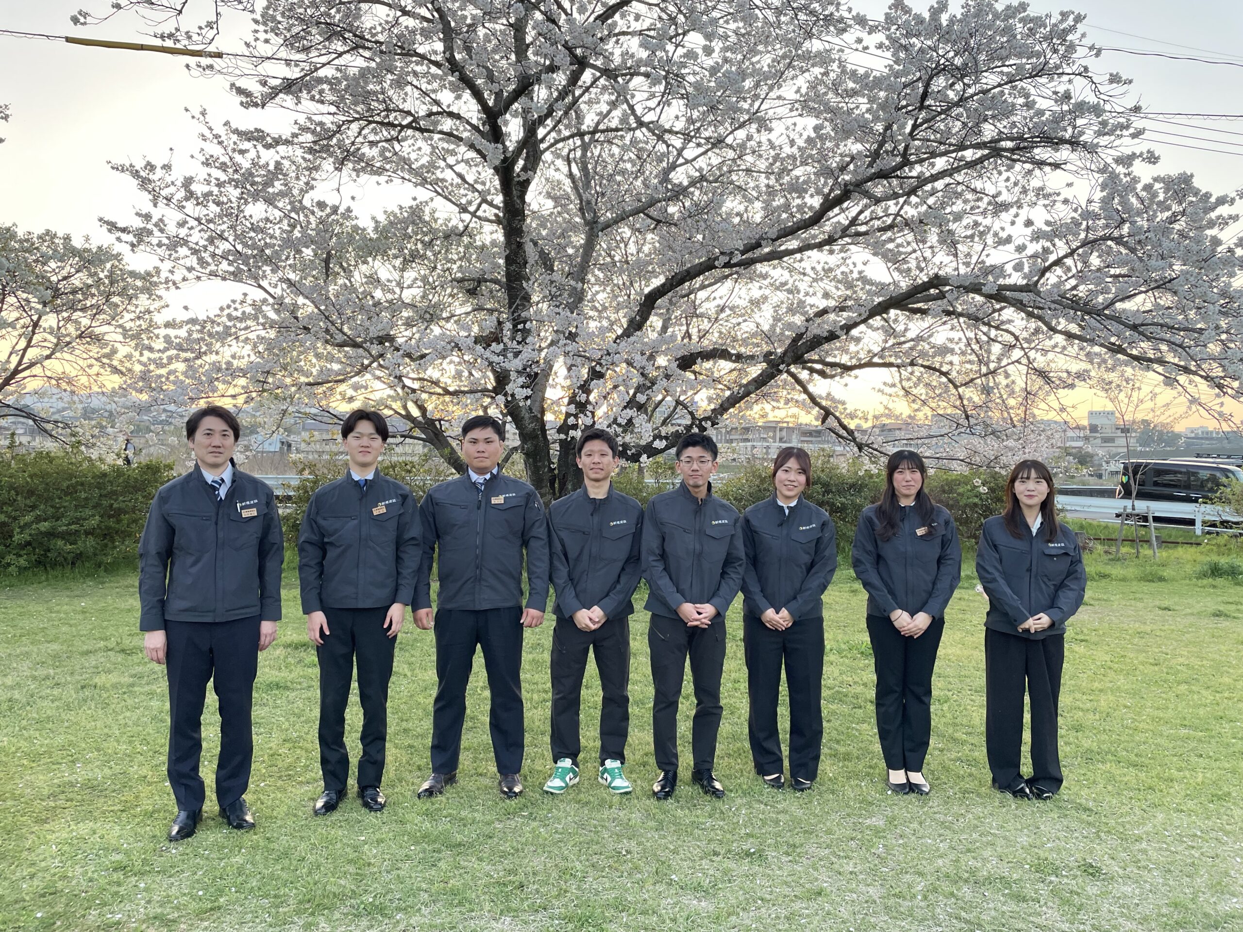 今年度は大卒1名・専門学校卒3名、高卒2名の計6名(非住宅施工管理職2,住宅施工管理職1,インテリアコーディネーター職1,大工職2)が、あらたに新規建設のメンバーとなりました。また中途採用2名(住宅施工管理職1,インテリアコーディネーター職1)も本日入社致しました。最初は皆緊張した顔をしていましたが、当日夕方からの恒例「花見」では、皆リラックスした表情を見せていました(^^)/ 今後の成長が楽しみです!