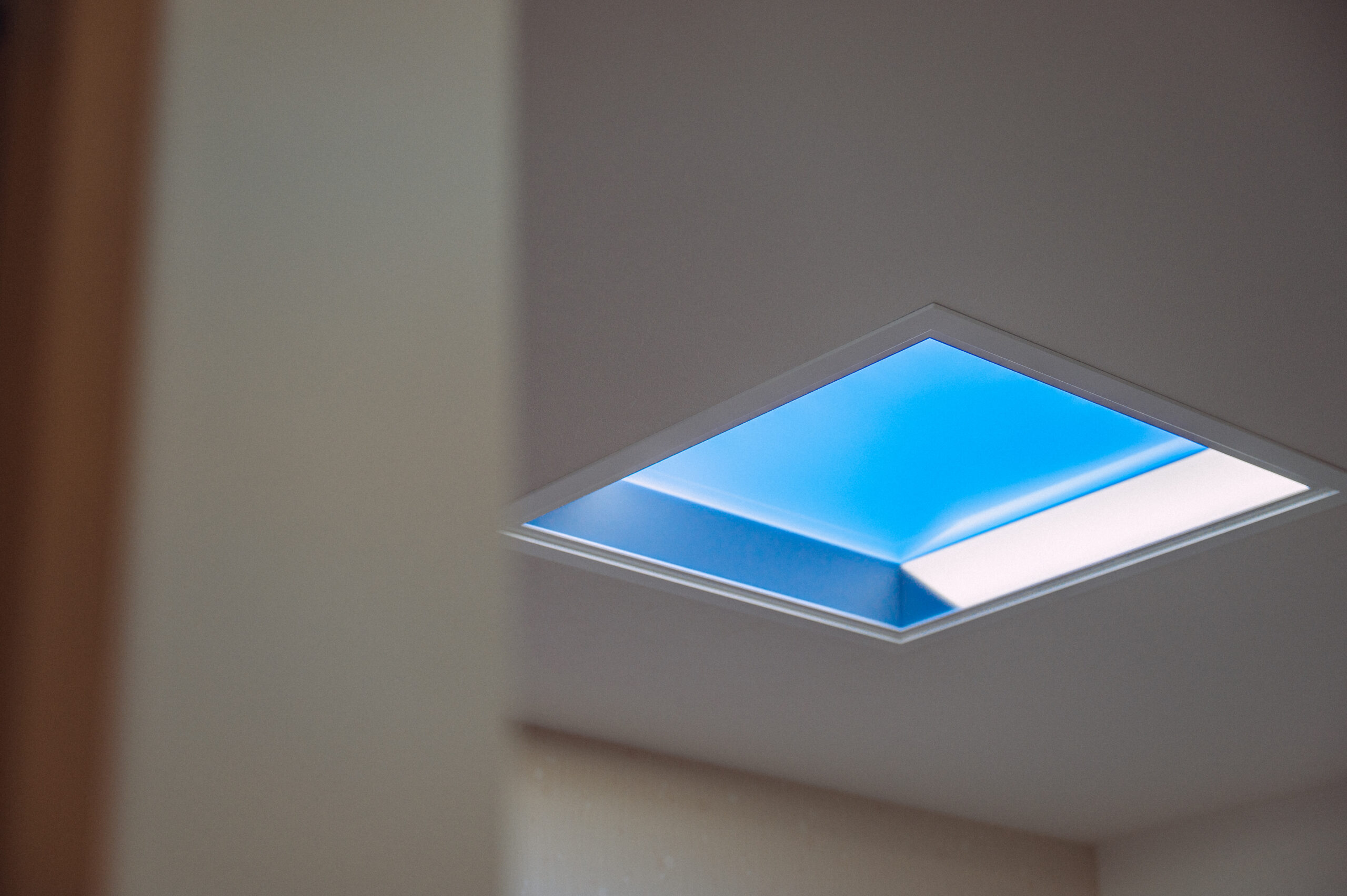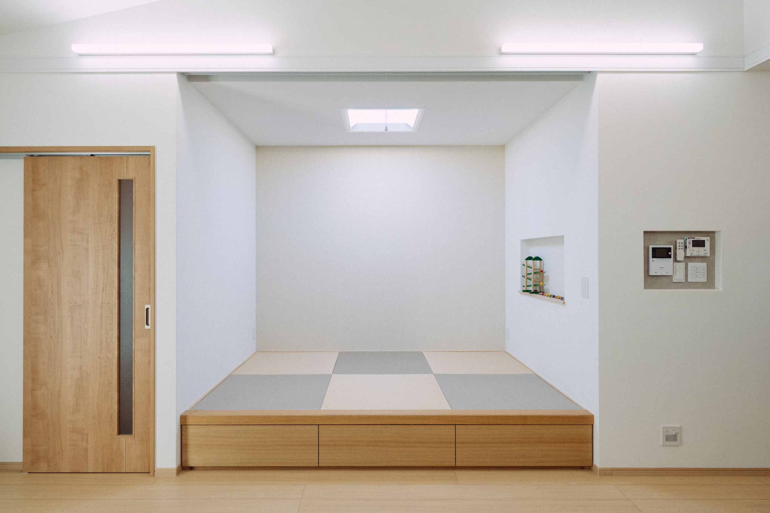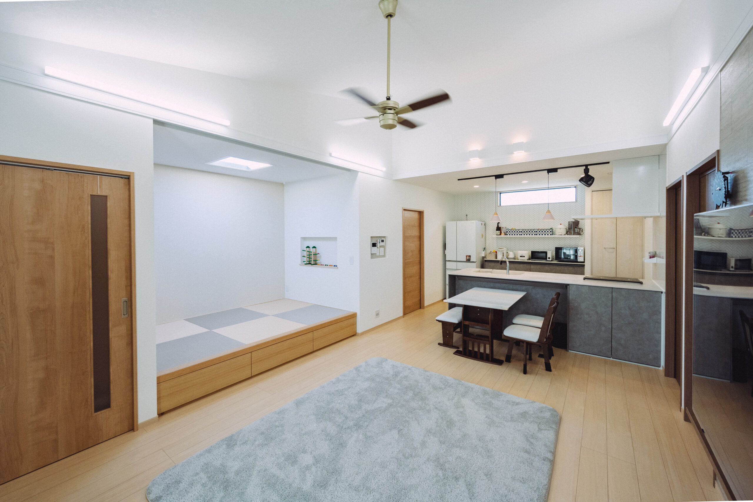 勾配天井とリビングの小上がりです。小上がりには、電気関係の仕事に携わる主人が一目惚れした「天窓に見える照明」を設置しました。下は収納スペースになっていますし、ロールスクリーンを完備しているのでゲストルームとしても活用できます。