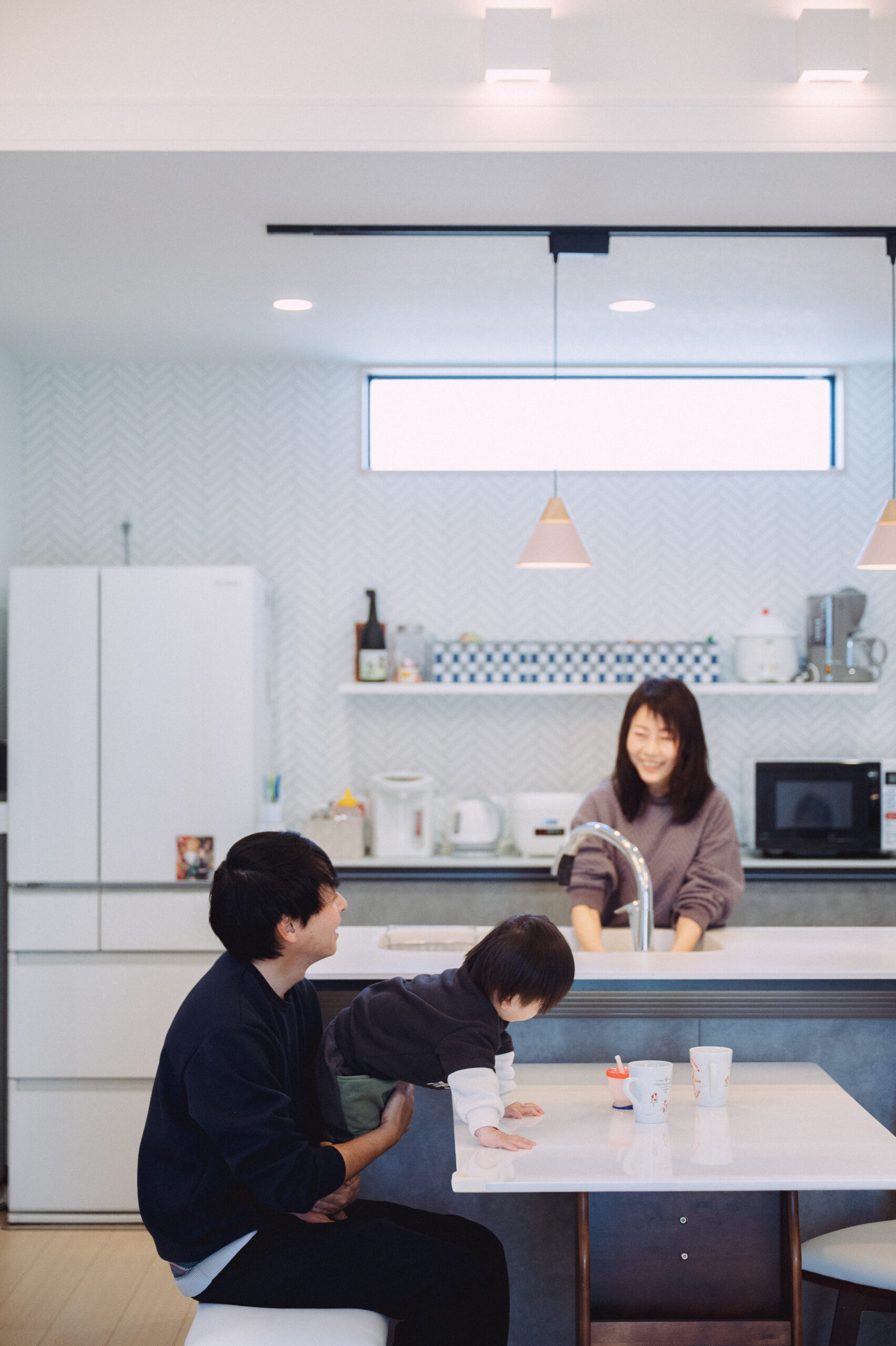 「よく『家は3回建てないと満足できない』って聞きますよね。でも、1軒目で後悔が一つも見つからない、最高の家が完成しました」と微笑むKさんご夫妻。穏やかで快適な暮らしの中心にあるのは、勾配天井により開放感が生まれたリビング。その周りに小上がりの和室、寝室、子ども部屋、書斎を配置することで、「廊下」を作らない省スペース設計になっています。「元々は、予算内に収めるために設計士が提案してくれた間取り」でしたが、どの部屋に行くにもリビングを通る必要があり、「家族の気配を感じながら暮らせる点もお気に入り」とご夫妻は語ります。広く取ったランドリールーム兼脱衣所にはファミリークローゼットを備え「洗う、干す、しまう」が1か所で完結。家事の時間も設計力で夫婦の楽しみに変わっているようです。